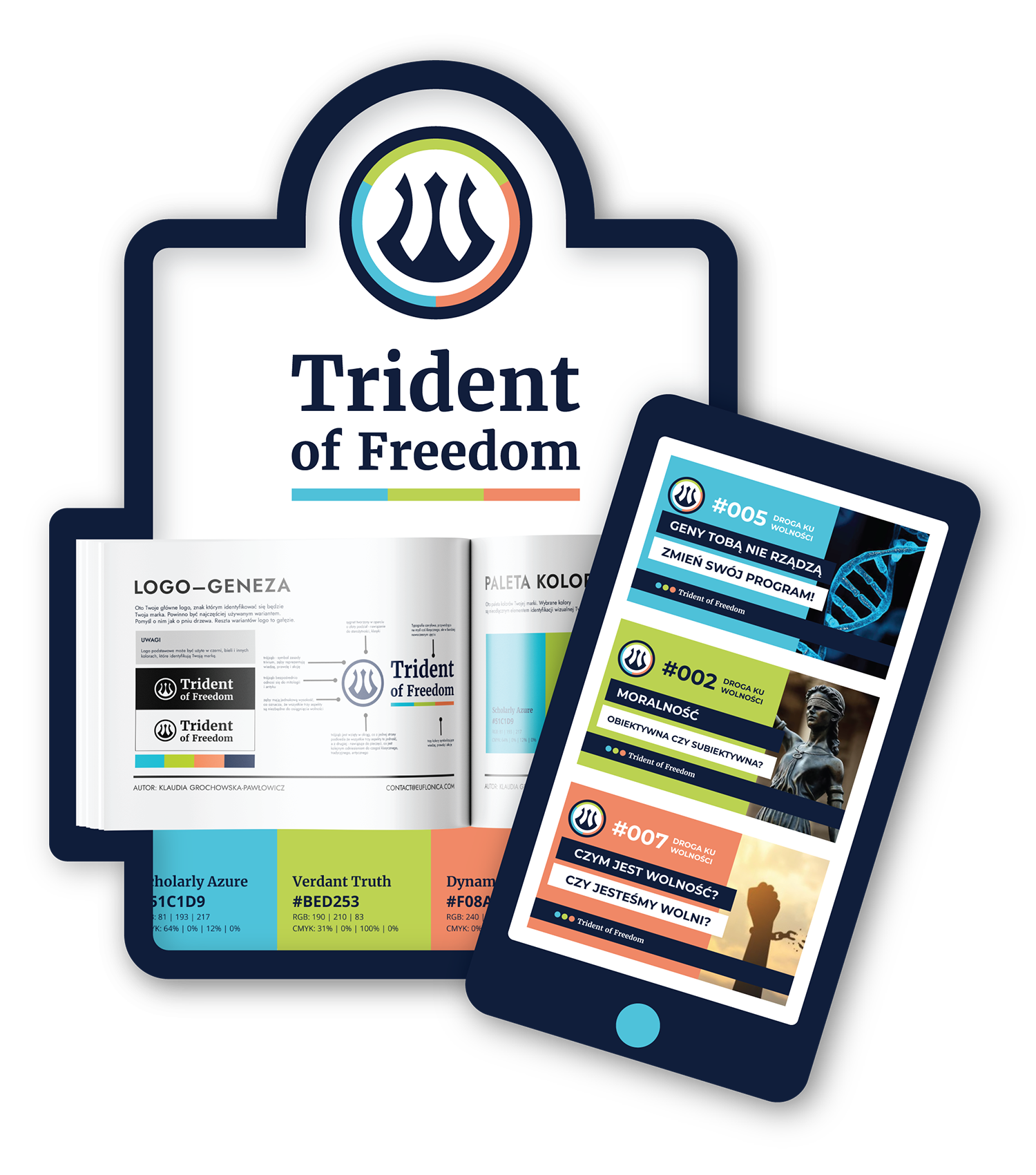 Projekt identyfikacji wizualnej dla Trident of Freedom powstał na bazie precyzyjnie opisanej idei – wolności jako działania opartego na trzech filarach: wiedza → prawda → akcja.